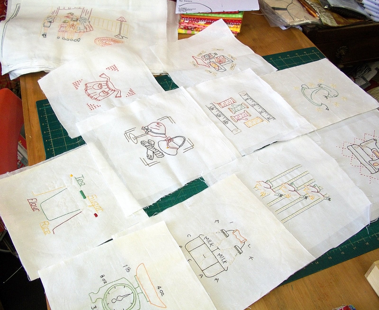 I finally sewed the last stitch in the embroidery blocks a week or so ago, and here they are being trimmed to size for sewing into the quilt. It was quite a departure in style for me. Firstly, it's designer's concept and, and secondly it is primarily a hand embroidered work. I can honestly say, it's the first embroidery I've done since college art class. And I really enjoyed it! It was a bit s l o w (for a machine quilt piecer) but...